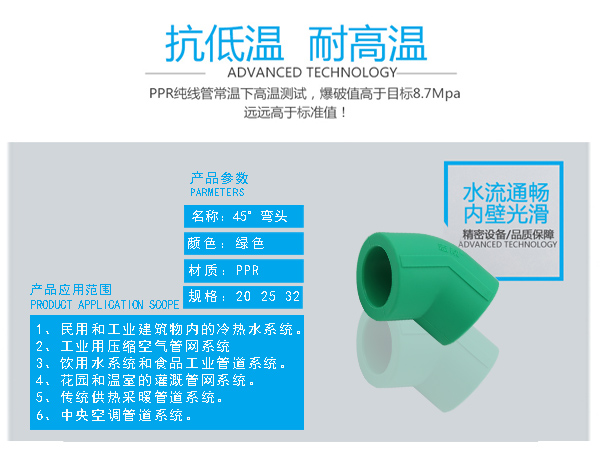 □ 管件連接牢固:由于聚丙烯具有良好的熱熔接性能,熱熔連接將同種材料制造的管材和管件連接成為一個(gè)整體,杜絕了漏水的隱患。